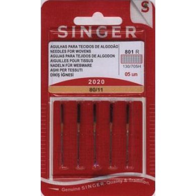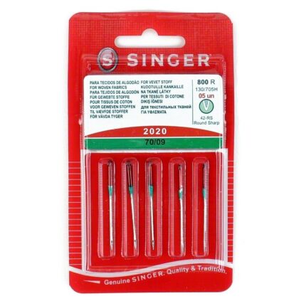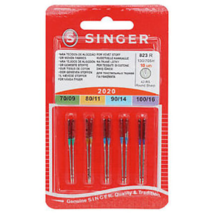 Her får du fem standard symaskine nåle. Standardnåle passer primært til vævede stoffer. Passer til alle Singer symaskiner.