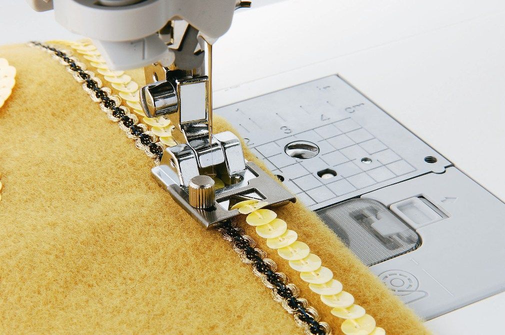 Båndpåsyningsfod. Denne fod anvendes til at sy pyntebånd (op til 5 mm) på stoffet.