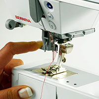 Netop uøvede syersker synes ofte, at det er svært at tråde rigtigt ved trådskifte. BERNINA 330’s halvauto- matiske nåletråder sparer tid og sørger for ekstra komfort: For at trådskiftet kan forløbe let og gnidnings- frit, er BERNINA 330 udstyret med et halvauto- matisk trådersystem, som begrænser arbejdet ved trådskifte til et minimum, og også minimere fejlmulig- heder. Ingen kompliceret trådføring, ingen bladren i brugsanvisningen – BERNINA 330 reducerer trådningsproceduren til det mest nødvendige og undgår problemer før de overhovedet opstår. Sådan kan du hurtigt vende tilbage til dit syarbejde og koncentrere dig helt om den kreative del.