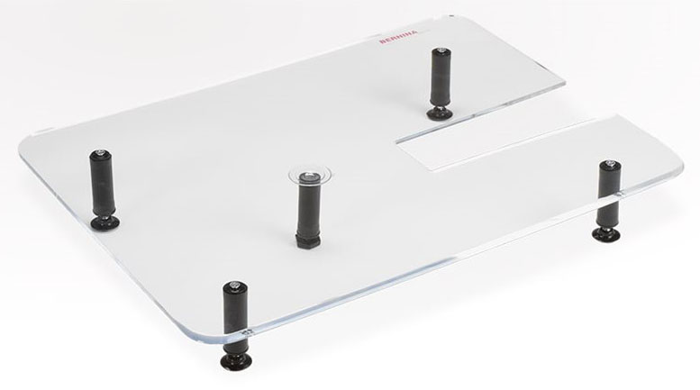 Quiltebordet af plexiglas letter arbejdet på store quilteprojekter som sengetæpper, tæpper eller vægtæpper. Det udvider arbejdsfladen og fordeler vægten af quiltearbejdet jævnt ud over bordet. Quiltebordet af plexiglas er meget stabilt. Stoffet glide r fremragende på den glatte overflade. Sammen med BERNINA quiltefoden # 29 eller Echoquilt- og CutWorkfoden# 44C bliver selv svære quiltearbejder helt rene og præcise.